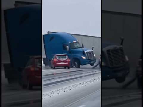 Trucker trying to maneuver around crash takes a tumble down a snowy hill #americantruckdrivers