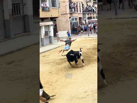 Aficionado taurino salto del ángel al toro más agresivo #toros #parati #bravos #sale #saltos #calle