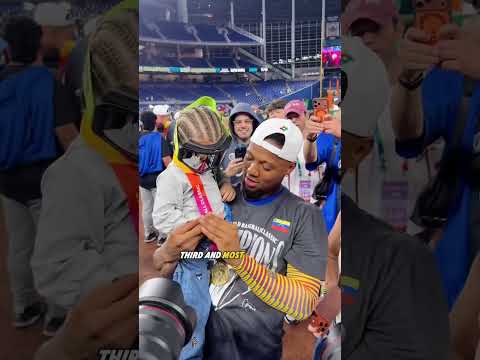 Ronald Acuna Jr. gets tangled up with fans on the field during the game 👀 #shorts