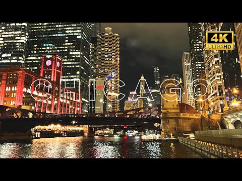 [4K] Chicago River Walk At Night - Binaural City Sounds Virtual Walking Tour 2022