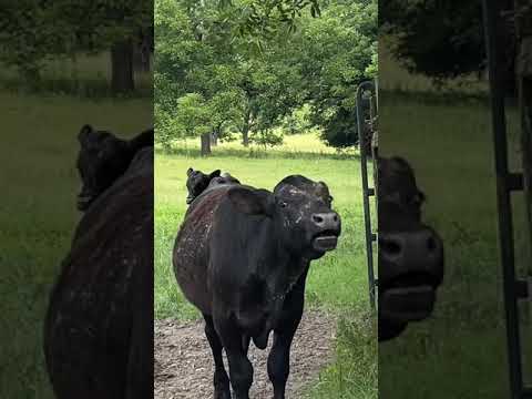 This bull calf is yelling at the top of his lungs. Limousin and angus breed cattle. Moo.