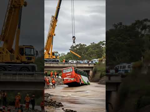 crane rope broke! large bus fell into the river during evacuation.