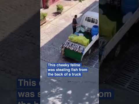 Naughty cat caught stealing fish from back of truck