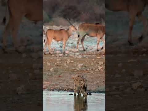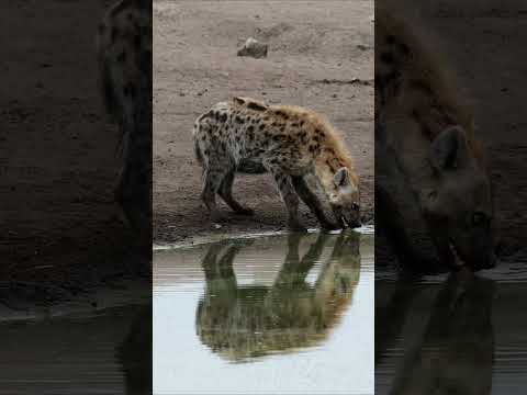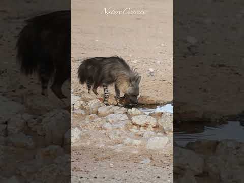 Brown hyena and jackals peacefully drinking from the watering hole #nature #shorts #wildlife