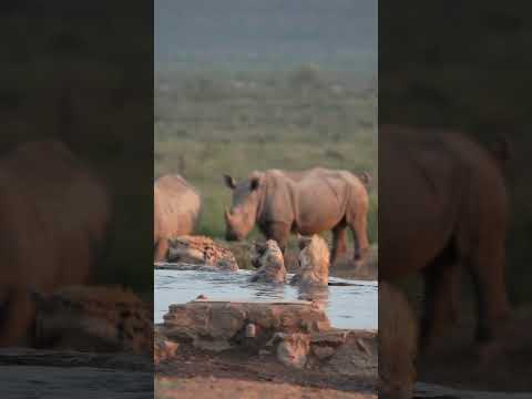 Hyenas swimming in the rhinos drinking water