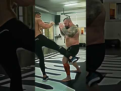Eddie Hall gets kicked in the leg by pro mma fighter #gym #mma #strongman #eddiehall #shorts #kick
