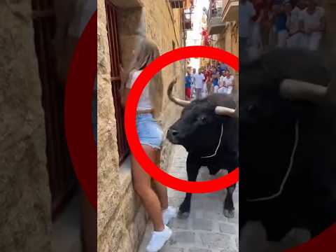 Toro asusta a chica en encierro en España #españa #toros #bull