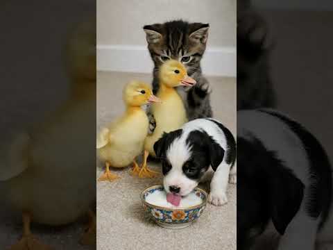 Cutest Trio Ever 🐱🐥🐶 Kitten Plays While Puppy & Ducklings Drink Milk