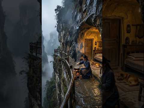 Cooking on the edge… while the rain falls 🌧️🔥Would you live here? #shorts