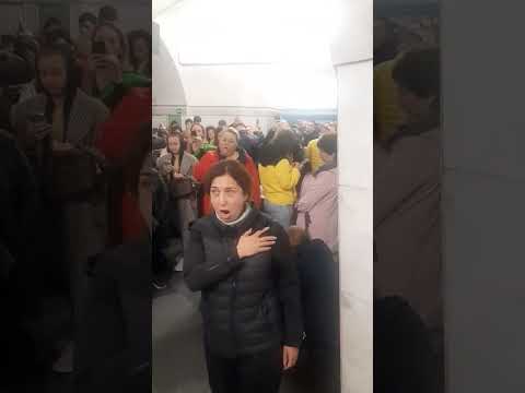 Ukrainians sing national anthem whilst sheltering under a subway station