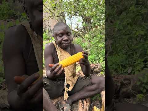 Hadzabe Tribe bushmen Chabba first corn experience in his traditional lifestyle in the bush 🥰